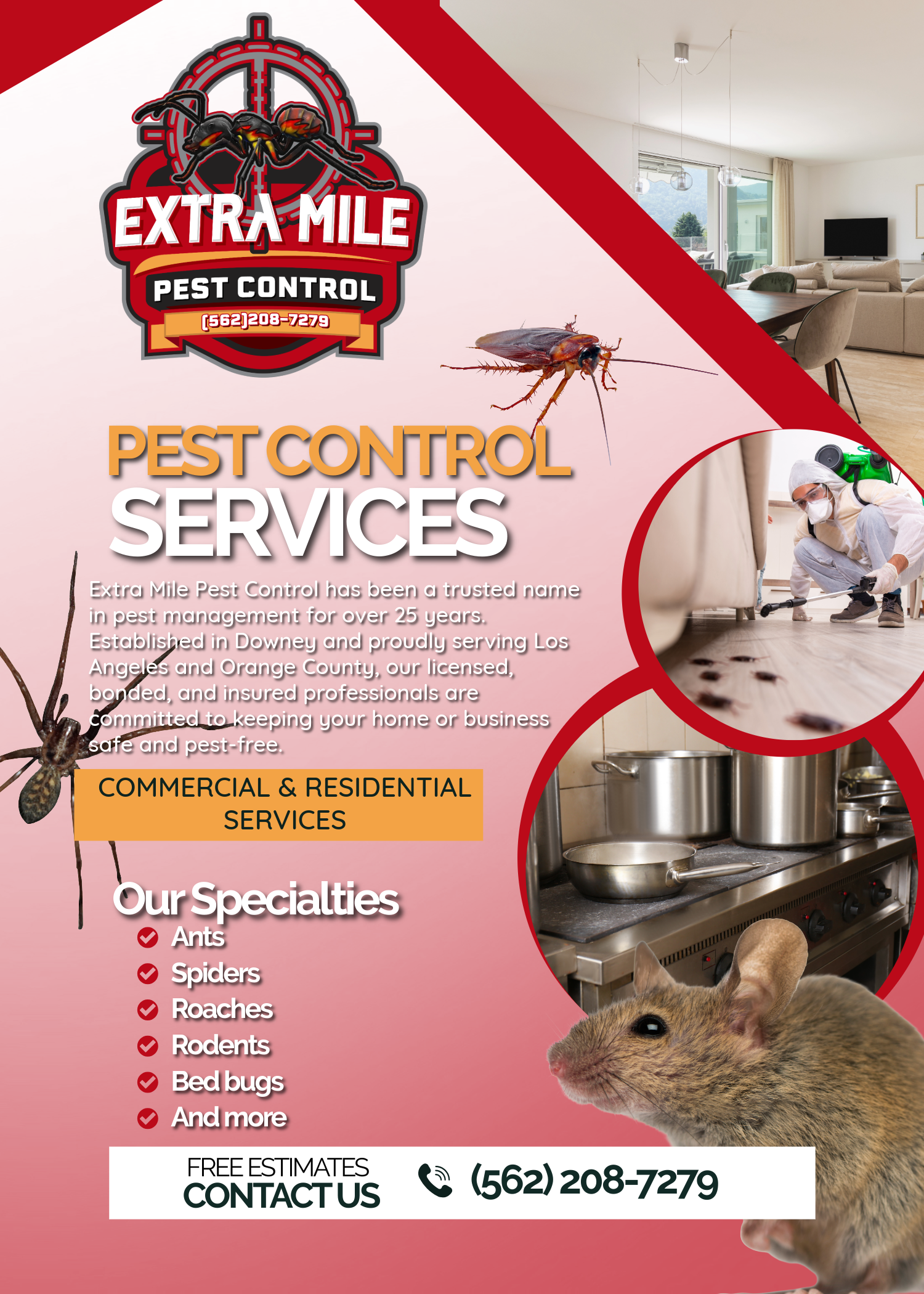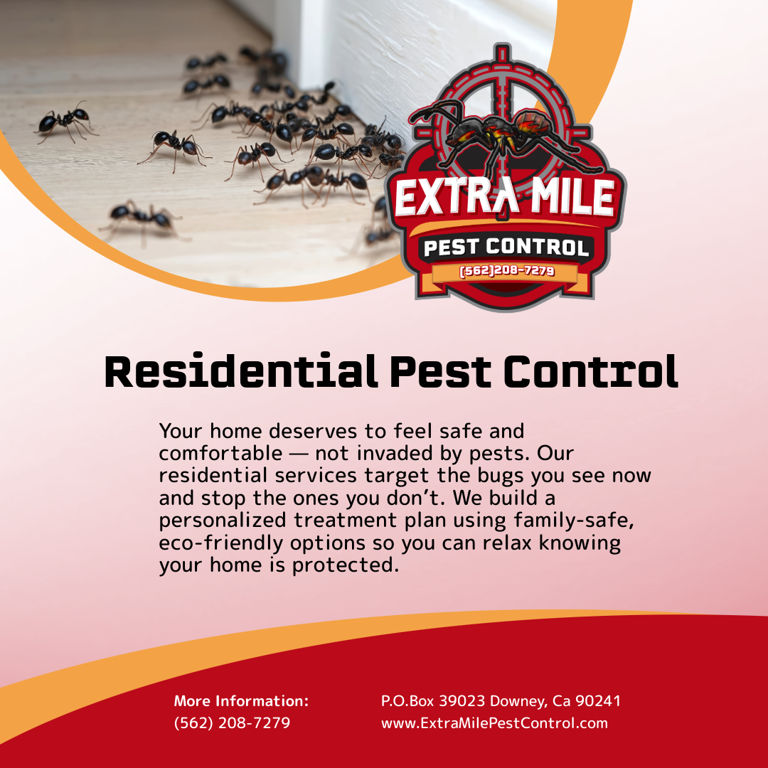 Extra Mile Pest Control is a pest control service in Downey, CA, US. We eliminate common household pests such as ants, roaches, rodents, and spiders. We offer effective solutions to keep your home pest-free. Contact us for an inspection and a personalized pest management plan.